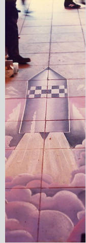 My scheme was to make Thatcher then Reagan as independent portraits to cash in on the early morning conservative/republican dime. Later that day smoke and missiles were added, floating our leaders heads in a kind of battlefield haze. Interestingly during that hour or two when the image morphed from one politic to the other there was a distinct lull in the flow of appreciation. The final touch was to make an intercontinental-ballistic missile actually breaking the mural's frame, as if on its way up Market Street, aimed towards Manchester's Picadilly business and commuter district. I think my point was, this would suck. The late afternoon crowd generously agreed.