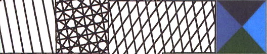 They are cross-hatched in 4 directions to suggest interference like a moire' effect. To their right black, white and grey masses are supended against a quilted blue diamond-plate pattern. These effects subtly shift against each other like reflections on a still pond.